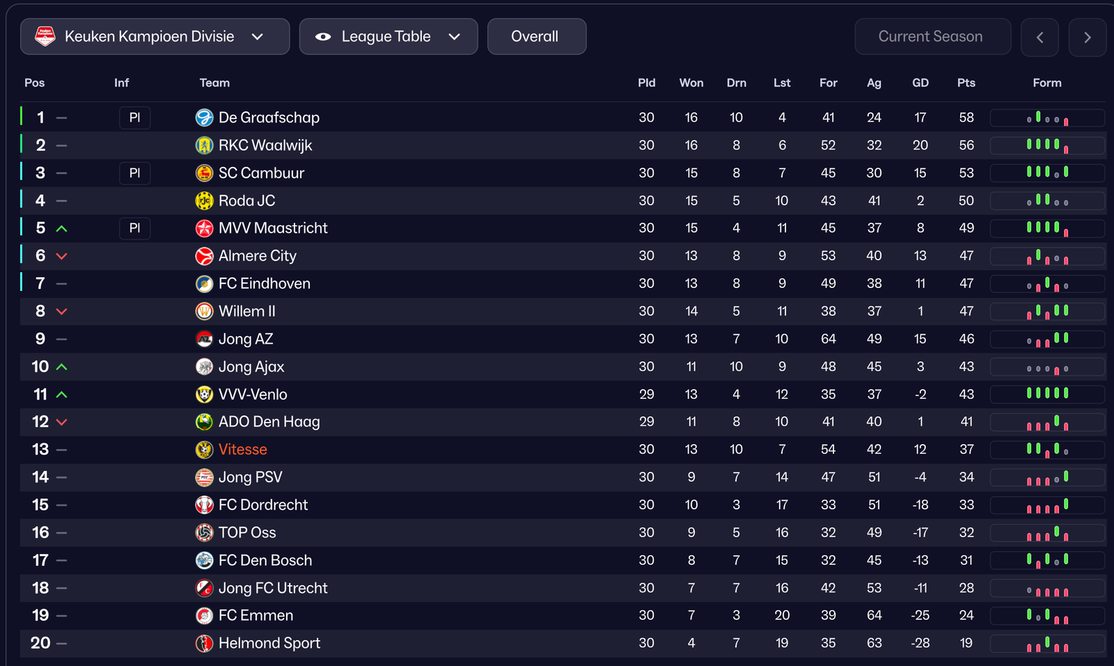 Vitesse Arnhem ā 30 Games In: The Halfway HouseKeuken Kampioen Divisie ā Matchday 30 (April 5, 2025) Current Standings: Pos Team Pld Pts 8 Willem II 30 47 9 Jong AZ 30 46 10 Jong Ajax 30 43 11 VVV-Venlo 29 43 12 Ado Den Haag 29 41 13 Vitesse 30 37 ... ... ... ... 17 FC Den Bosch 30 21 *(Points earned on the pitch: 49. Sanctions: -12. Safety secured. Play-offs? 10 points away, but the maths still works.) Temp stands in the Papendal canteen on a drizzly Monday, marker pen in hand, circling the "37" on the whiteboard like it's a personal dare. "Thirty games," he tells the backroom staff over koffie. "We started at minus twelve. Now we're eleventh on merit. Thirteenth with the baggage. That's not a story. That's a fucking statement." The Grind: What 30 Games Look LikeW: 13 | D: 10 | L: 17 Goals: 54-42 (finally positive) Away record: 7W-7D-2L (the real miracle) Attendances: 15,030 avg. (Theo Bos Stand sold out 14/15 home games) No more minus points panic. No more "survival" whispers. The Gelredome faithful now chant for promotion. But 10 points off 8th with 8 games left? It's a sprint. Temp's mantra in every presser: "We're not chasing shadows. We're chasing the badge." The Focal Points: Three Wins That Defined the SurgeVitesse 1-0 Almere City A Elias Huth 5th minute goal was all it took. Bendtner in post-match: "That's how you make a statement on a Saturday" Jong FC Utrecht 1-2 Vitesse Ice-cold execution. Schwarz's 60-yard radar pass for 1-0; his overlapping run for 2-0. "Little Ronnie" Temp: "SChwarz is our little magician" Vitesse 5-2 Helmond Sport The comeback etched in Gelderland folklore. 2-0 down ā 3-2 up in 18 minutes. Bonnah and Van der Werff running the show. TikTok clip: 3.2M views. Bendtner to the ref: "That's my left-back, ref!" The Heroes Holding It TogetherPlayer Apps G A Key Stat Solomon Bonnah (LB) 29 4 4 1.4 xG 3 PoM David van der Werff (AM) 18 4 3 xG 5, xA 4.5, Pass % 93% Timo Zaal (CDM) 30 5 3 91% pass accuracy Elias Huth (ST) 19(6) 8 1 xG 7.5 Bendtner Effect: 18 of 48 goals from open play. "My little psychopaths," he calls them. Sessions now feature "Bendtner Drills": 1v1s where losers do press-ups while he narrates their Arsenal misses. The Road Ahead: 24 Points Up for GrabsDate Opponent Venue Notes MD31 (Mar 20th) SC Cambuur Home Must-win (we drew 1-1 in October) MD32 (Mar 27th) TOP Oss Home Play-off chasers MD33 (Apr 3rd) Willem II Away Must-win MD34 (Apr 10th) RKC Waalwijk Home Chance to beat a promotion chaser MD35 (Apr 17th) Roda JC Away Play-off chaser MD36 (Apr 24th) VVV-Venlo Home MD37 (May 1st) De Graafschap Away Warm-up for finale MD38 (May 8th) FC Emmen Away Potential Play-off spot Maximum haul: 37+24=61 pts. Enough for top-8 in most scenarios. Realistic: 5 wins = 52 pts. Play-off contention. Minimum: 3 wins = 46 pts. Safe mid-table, head held high. Temp's Locker Room Memo (Pinned to Every Door) On April 5th, after a 3-0 win over FC Dordrecht, the squad bus back to Arnhem blasted "Sweet Caroline." Bendtner stood up, pink sunglasses on, and yelled: "Eight games to make the world remember Vitesse again!" Solomon Bonnah, quiet as ever, just nodded at Van der Werff: "We got this." In Presikhaaf, that kid with Football Manager 2026 is already editing the Vitesse badge with flames around it. Temp's pixels are about to become playoffs. Or at least, that's the plan.