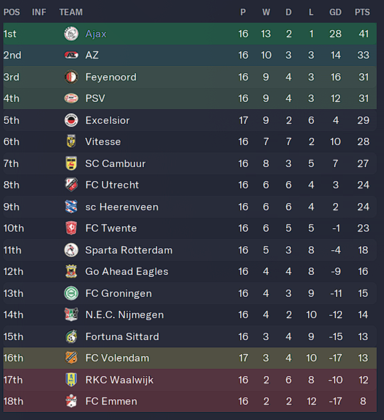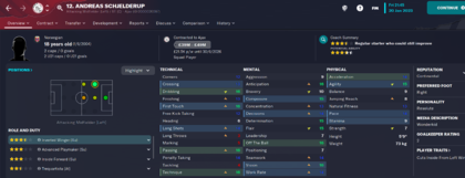 Mid Season Update This was the kiss of death haha! What started off with a sloppy defeat to Chelsea followed 3 great performances to put us top of the group. We then fell off in the Final 2 games with a 2-1 loss in Salzburg to 10 men of RB (pay back for buying Simic) then another defeat to Chelsea. Europa League to play with a game against Danish side FC Midtjylland It's a banana skin tie but one I'm confident of not slipping on. In the league, well its business as usual, 16 games in won 13 drawn 2 lost 1. A nice gap forming. Sorry @TempelmanVitesse aren't chasing they're just Vitesse. The team are chipping in with the goals Brobbey the top scorer with 6 showing that we have goals in the team. Scheljderup has fast become my first choice left winger with some dazzling displays. Which means I can get rid of Berghuis or Tadic. Though I'm fast losing patience with Tadic and his disciplinary record. I waited before slowly bedding in Simic in the team, who has scored 5 in 3 games and 3 in 1 cup game so far. Kenneth Taylor looks like the new CM wonder kid from the academy. Making the CDM position his own . The vultures are already circling. Another youngster making a splash in the first team is 17yr old Garbiel Misehouy.