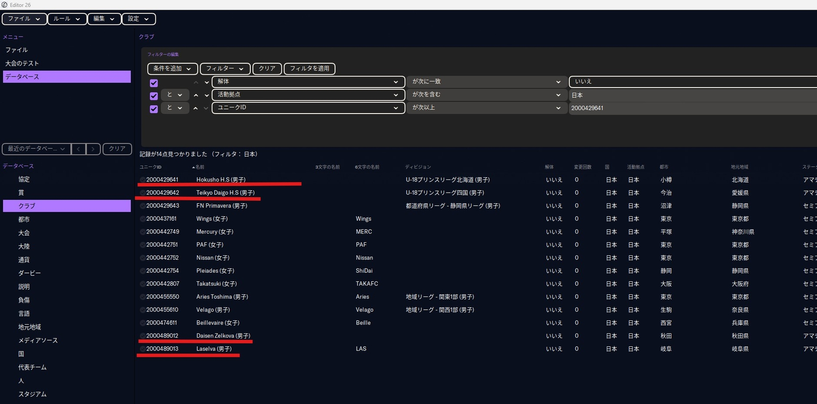Please first expand the search limit to 10,000. There are over 500 data entries. The numbers include girls' clubs, but there are 2,175 clubs in Japan that are considered active. If we look at only boys' clubs, there are 2,109. We received confirmation that for clubs where activity could not be verified, feedback has been provided to the official, and corrections are scheduled to be made in FM27. FM26_Japanese_Club_Name_2600.lnc