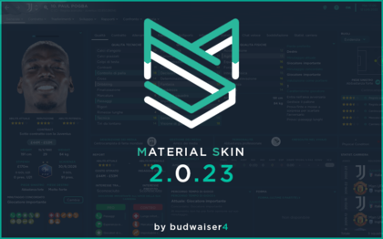 Hi everyone! First of all, I sincerely thank all those who appreciated the work done the previous years and who have given their contribution by leaving feedback on the skin and at the same time I apologize if in the last period I have not been able to make the changes you requested. Also this year the Material Skin is ready for you! It is still in beta and improvements are likely to be made in the next few days. I hope you will enjoy my work again this year. Cheers V01Fix Match Panels V1.1 Fix Contract panels Fix Contract player subpanel V1.11 Added Instant result in team selection before match Fix Nation Overview Panel V1.12 Fixed new game selection team Fixed icon formation post match V1.13 Fixed new game panels section game mod Fixed price in profile (the thousands are now m and not M) V1.14 - Fixed match preview lineups - Fixed sidebar in small screen - Fixed calendar (a black box appeared randomly) - Fixed some translations - Added player status in Cut Out/DF 11 mod and in non player - Various minor fix and improvement if you notice any bugs write me in private and I will try to solve ASAP DONATIONS paypal.me/budwaiser4 DOWNLOAD