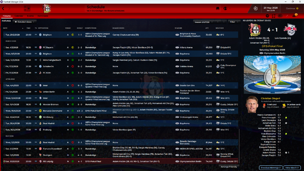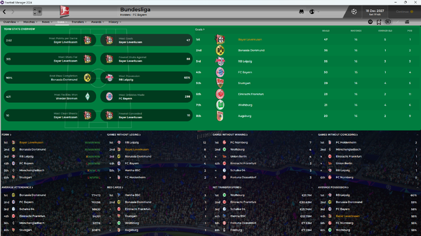 UPDATE: We had a quiet January transfer window, was able to sign Chukwuemeka from Chelsea on a free transfer, with midfield options limited I decided to pay $1.8 Million to get him right away and he has been a good addition so far. Leon Goretzka was unwilling to extend his contract and will leave in the new transfer window to make some big money in Saudi Arabia at Al-Hilal............ The team is not as "undefeatable" as in real life, but as before really nothing to complain about! Sitting in first place in the Bundesliga with only a few more matches to play. Lost 4 matches, drew 1 and won 24 of the 29 matches. 11 points clear of Bayern Munich. In the Champions League made it to the Semi Finals after getting a huge scare in the Quarter Finals against Internazionale Milan. Lost 0-3 in the away match (xG was similar but as always it's the goals that count!) in the home match Marzano was going "all-in" and with 3-0 ahead the game went into extra time. 6-1 win with 4 goals all together in the added time 😉. In the Semi-final Real Madrid awaits so that will be a real challenge. Still competing in the DFB Pokal too (semi-finals coming up). 3 prices still up for grabs for Marzano's team. I am using the training schedules that @Markitos used in his previous save and they are working very well, much better than the ones I used prior. Marzano's team is playing attacking football with a 4-3-3, 4th highest possession% at 56% in the Bundesliga and all the other stats are pretty solid too (see screenshots) Next week will have finished the whole season and will share how Marzano's quest with Bayer Leverkusen in his first full season ended!!!
