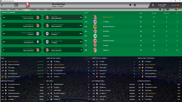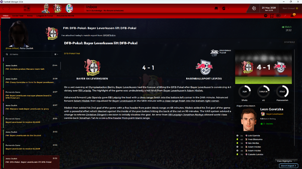 Marzano finished his first season with Bayer Leverkusen with some big successes. Winning a domestic double (Bundesliga title and DFB Pokal), while only being predicted #4 in the league. Unfortunately knocked out of the Champions League in the semi-final after two 1-0 defeats against Real Madrid.Needless to say that the board is absolutely delighted with Marzano as a new manager and likely even bigger clubs might be knocking on his door to ask for his signature 😉 I have added some screenshots showing the Bundesliga season summary, the tactic I used with Bayer Leverkusen this season which is an attacking 4-3-3, average 57% possession in the Bundesliga. Looking for someone to take over Marzano's reign, the download link to the save game for the end of the season is included too. Bayer Leverkusen 4-3-3 v2.fmf FMG Pass The Save - Season 4 BAYER LEVERKUSEN.fm