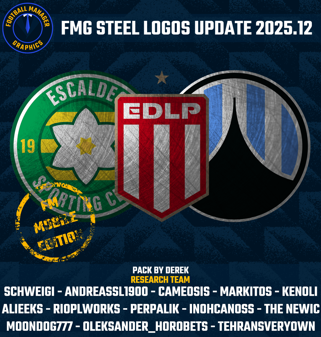 September 30, 2025Sep 30 Author Administrators FM Mobile FMG Steel Logos 2025.12 Pack & Template by @Derek Research Team @schweigi @AndreaSSL1900 @cameosis @Markitos @rioplworks @kenolio @perpalik @inohcanoss @Alieeks @Moondog777 @Oleksandr_Horobets @The Newic @TehransVeryOwn Pack Contents Each pack consists of official logos which we referred to as 'Normal' logos. We offer 'Alternative' logos in each of our packs which are logos that clubs may wear as shirt logos, perhaps in different colours, anniversary editions but are all based on official logos used by that organisation. We've also added 'Fantasy" logos to the packs which are great for future saves and 'Create-A-Club' games. In fact, all the logos created in our Design Factory are included in the megapacks. We have also got an option for the 'Retro' fans with a great selection of historic logos from many teams and competitions. Each pack also contains our very own default minimal style for those logos we haven't yet covered. However, if you wish to stick with the original default logos from the FM series simply delete our version in the megapack and unzip 'Original Default Logos' file. Installation Guide - FMG Monthly Logo Updates Drag and drop the contents (including the config files) of each folder in this update pack into the corresponding folder in the megapack and replace the existing logos when prompted. Do not drag and drop the actual folders as this will overwrite your megapack. Then simply go to preferences in FM and reload your skin. Alternative | Fantasy | Retro Logos To use any of the alternative, fantasy or retro logos in game you must remove the text at the end of each logo i.e. alt, retro or fantasy and drag and drop into the normal logo folder in the megapack. You will need to repeat this for all four sizes. Then simply go to preferences in FM and reload your skin. I would advise creating a copy of the original logos before replacing them.