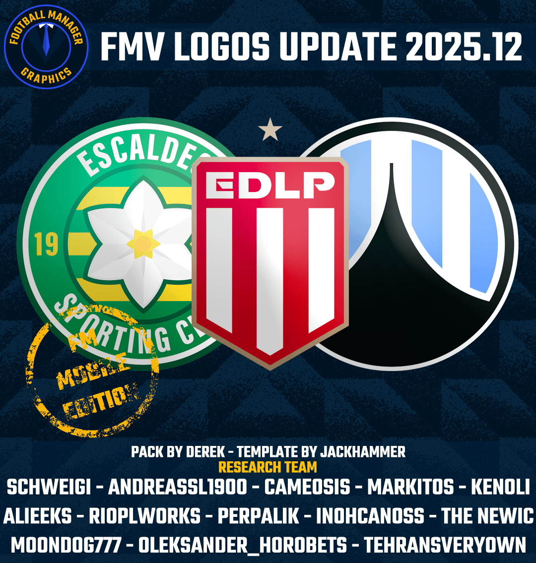 September 30, 2025Sep 30 Author Administrators FM Mobile FMV Logos 2025.12 Template by JackHammer - Credit Murray Pack by @Derek Research Team @schweigi @AndreaSSL1900 @cameosis @Markitos @rioplworks @kenolio @perpalik @inohcanoss @Alieeks @Moondog777 @Oleksandr_Horobets @The Newic @TehransVeryOwn Pack Contents Each pack consists of official logos which we referred to as 'Normal' logos. We offer 'Alternative' logos in each of our packs which are logos that clubs may wear as shirt logos, perhaps in different colours, anniversary editions but are all based on official logos used by that organisation. We've also added 'Fantasy" logos to the packs which are great for future saves and 'Create-A-Club' games. In fact, all the logos created in our Design Factory are included in the megapacks. We have also got an option for the 'Retro' fans with a great selection of historic logos from many teams and competitions. Each pack also contains our very own default minimal style for those logos we haven't yet covered. However, if you wish to stick with the original default logos from the FM series simply delete our version in the megapack and unzip 'Original Default Logos' file. Installation Guide - FMG Monthly Logo Updates Drag and drop the contents (including the config files) of each folder in this update pack into the corresponding folder in the megapack and replace the existing logos when prompted. Do not drag and drop the actual folders as this will overwrite your megapack. Then simply go to preferences in FM and reload your skin. Alternative | Fantasy | Retro Logos To use any of the alternative, fantasy or retro logos in game you must remove the text at the end of each logo i.e. alt, retro or fantasy and drag and drop into the normal logo folder in the megapack. You will need to repeat this for all four sizes. Then simply go to preferences in FM and reload your skin. I would advise creating a copy of the original logos before replacing them.
